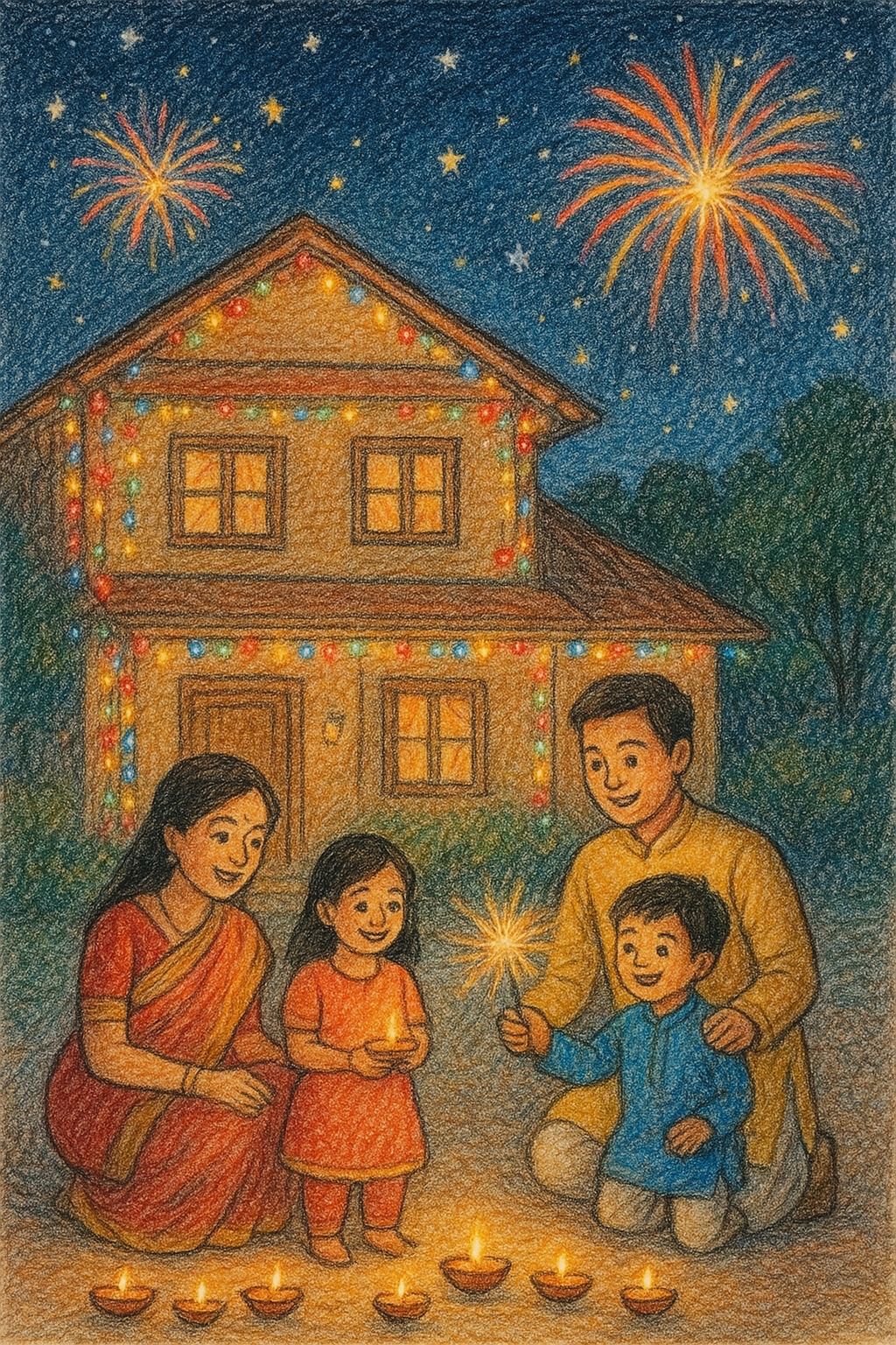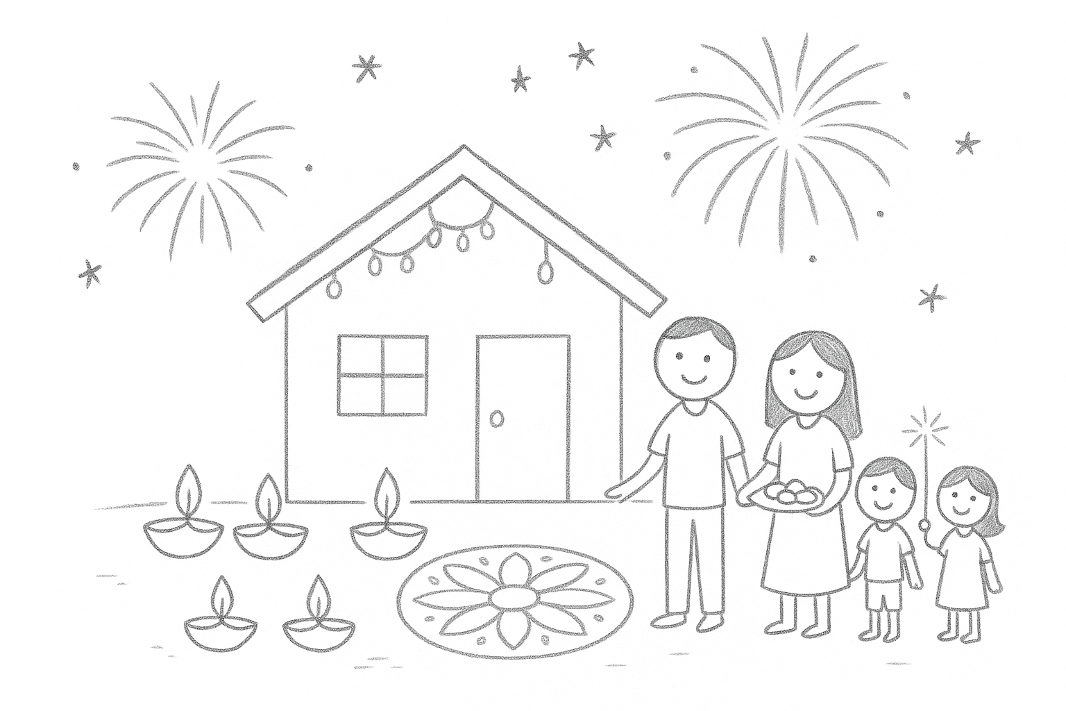 Draw a small house decorated with lights, flowers, and diyas outside the door, with your family waving happily.