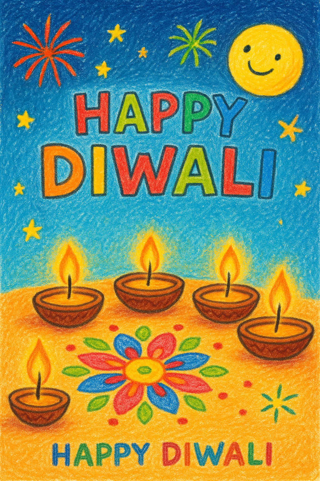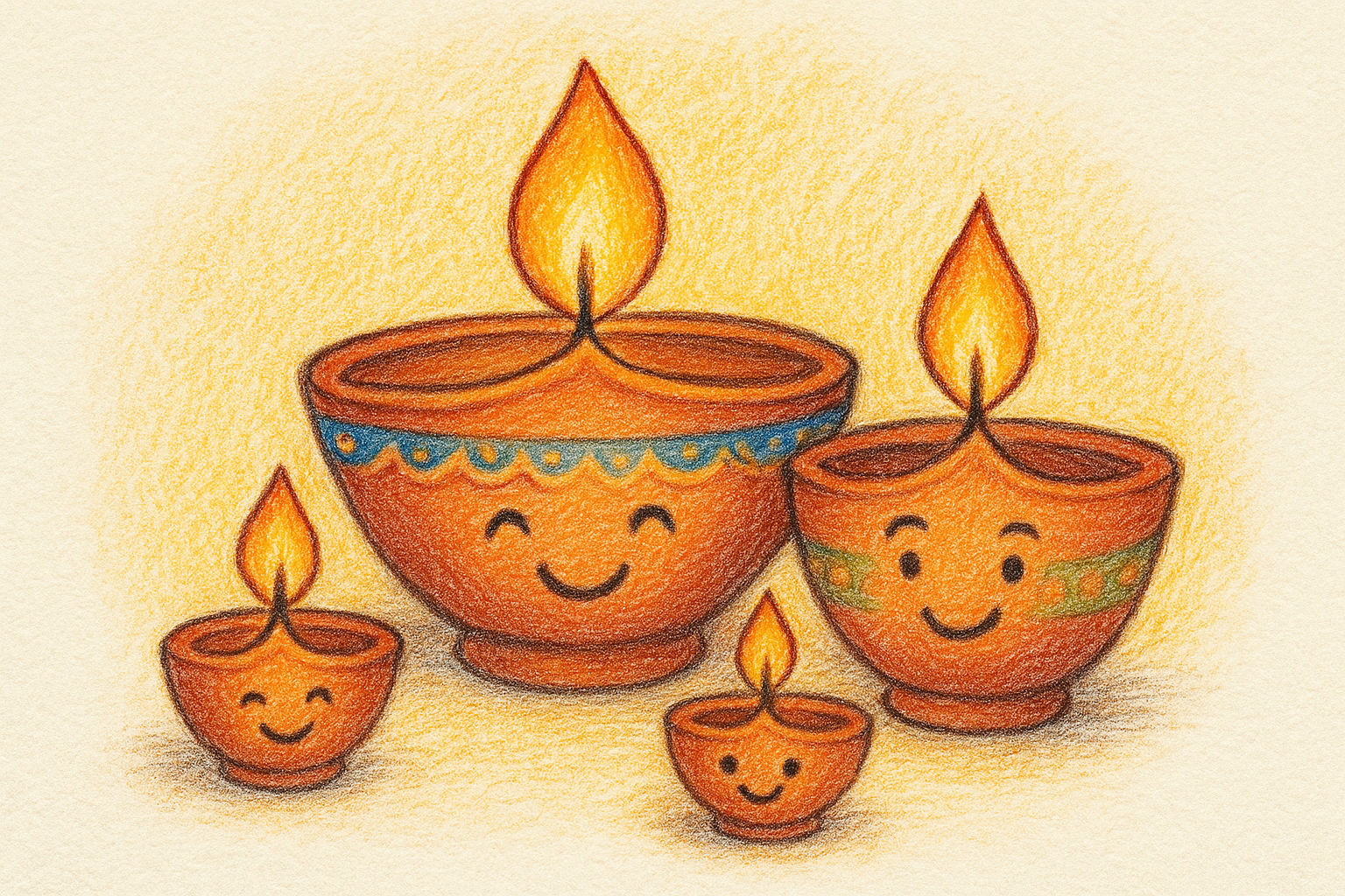 Draw a group of smiling diyas a big diya for (mother), a medium diya (father), and small diyas (kids) where all glowing together happily. Decorate them with patterns and colors.