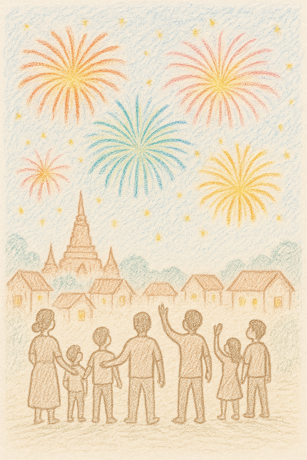 Draw the night sky that is filled with colorful fireworks bursting above buildings, temples. Add people or family watching and enjoying the sparkling view below.
