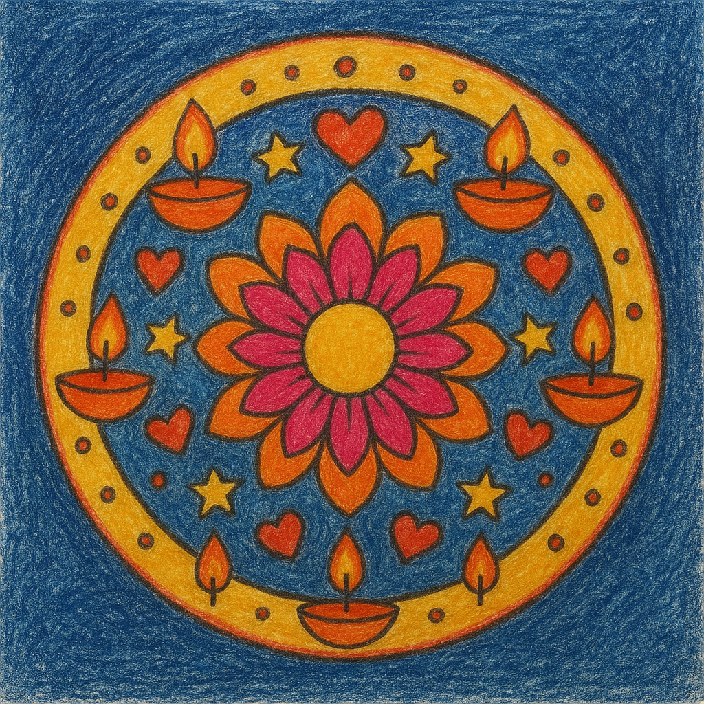 Draw a magical diya with golden light coming out, forming shapes of hearts, flowers, and stars around it.