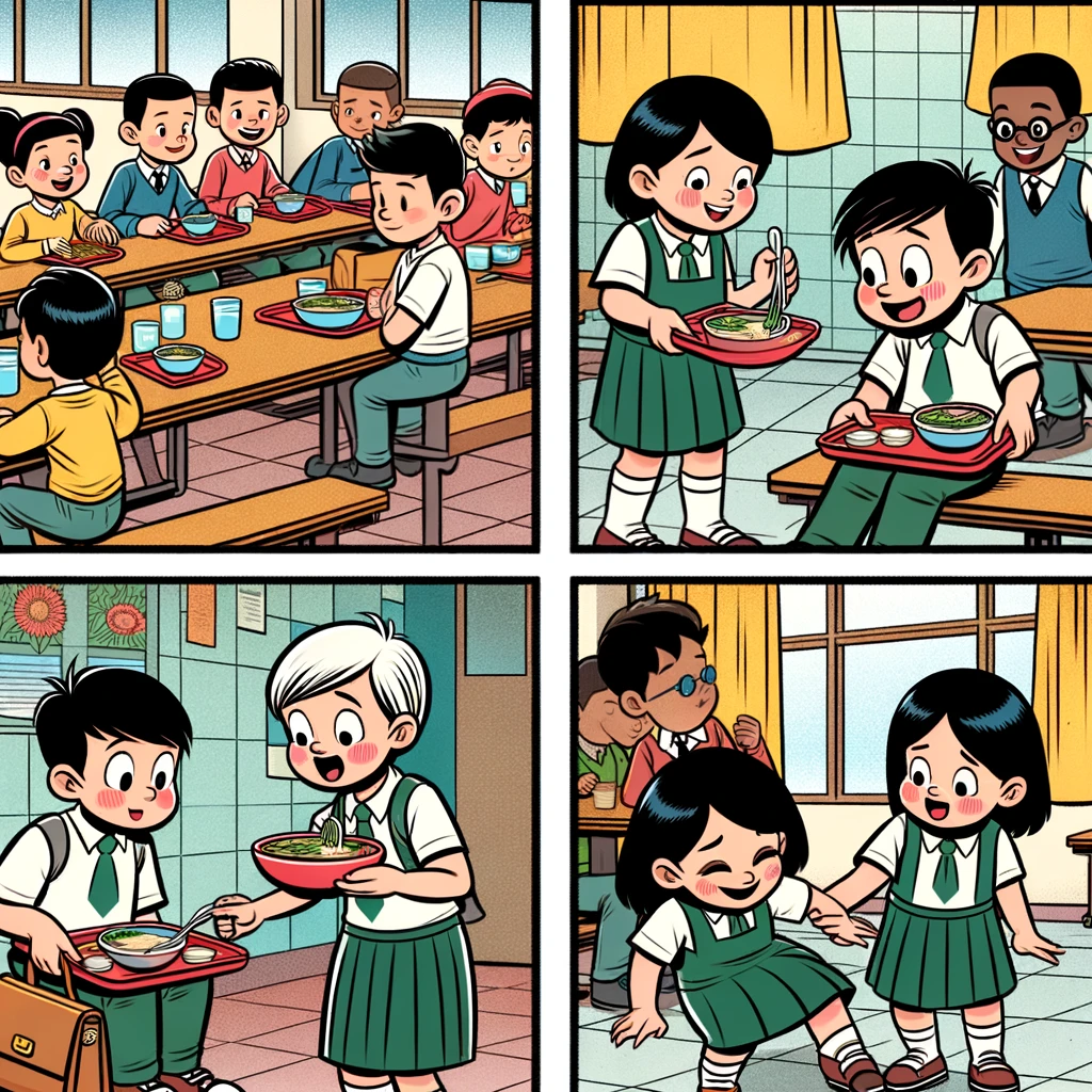 Another classmate, Jack, also joined them to see if Lily was okay. Even though Lily was embarrassed, her friends' kindness made her feel better. Jack even gave her his noodles to make sure she had something to eat. Lily felt grateful and happy to have such caring friends. They all sat down together to eat, and Lily realized how lucky she was to have friends who cared about her. This experience turned a potentially embarrassing moment into a heartwarming memory of friendship in the lively school cafeteria.